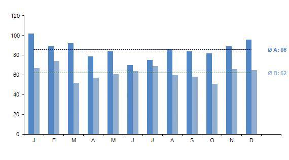 Hier werden zwei Datenreihen in einem Säulendiagramm mit nebeneinander angeordneten Säulen dargestellt. Für die Anzeige der Durchschnittswerte wurden die Punktdiagramme aus Beispiel 1 beibehalten. Um die Durchschnittswerte noch rechts neben den Dezemberwerten anzeigen zu können, wurde die X-Achse auf 13 Monate erweitert, wobei fuer X=13 keine Werte angegeben wurden um die Anzeige von Säulen an dieser Stelle zu unterdrücken.