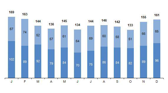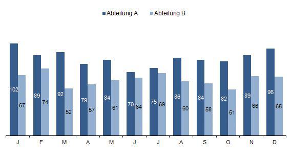 Hier kommt der Diagrammtyp "Gestapelte Säulen" zum Einsatz. Die Werte der einzelnen Datenreihen werden innerhalb der Säulen dargestellt. Zusätzlich wird die Gesamtsumme pro Monat über den Säulen eingeblendet. Angaben zu den Kategorienbezeichnungen fehlen hier. Diese können wahlweise als Legende oder auch als 13ter Datenpunkt (siehe Beispiel S1) eingefügt werden.