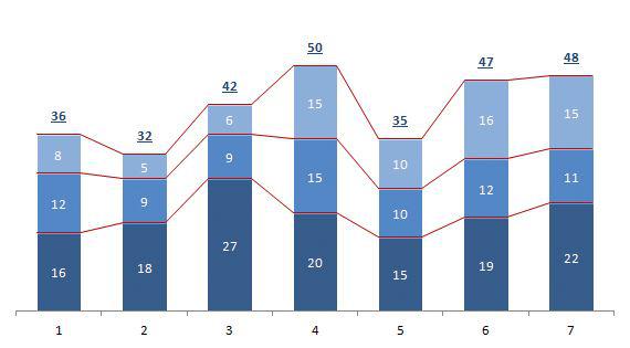 Hierbei handelt es sich eigentlich um ein klassisches, gestapeltes Säulendiagramm. Auf die Anzeige der Einzelwerte wurde verzichtet. Die Gesamtwerte der Säulen werden als Liniendiagramm eingeblendet. Das neue an diesem Beispiel ist jedoch die zweifarbige X-Achse, deren Dicke sich über ein Korrekturfeld vom Benutzer einstellen lässt. Diese wird mit Hilfe zweier Säulendiagramme erzeugt!
