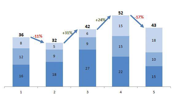 Ein gestapeltes Säulendiagramm zur Anzeige von Quartalsdaten über einen Zeitraum von 5 Jahren. Die Jahreszahlen, die hier oberhalb der Säulen dargestellt werden, werden ebenso mit Punktdiagrammen erzeugt, wie die grafische Hervorhebung des jeweiligen Maximalwerts pro Geschäftsjahr.