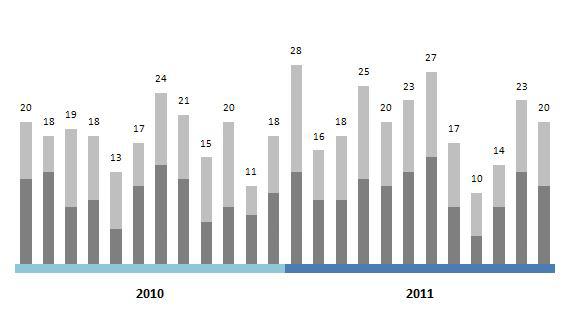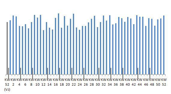 Ein relativ einfaches Säulendiagramm zur Anzeige von 52+1 Kalenderwochen. Zusätzlich zur Angabe der KW auf der X-Achse werden hier mit Punktdiagrammen Trennstriche zwischen den Monaten sowie die Namen der Monate zentriert unterhalb der jeweiligen KWs angezeigt. Um unterhalb der eigentlichen X-Achsenbeschriftung Platz für diese Einblendungen zu schaffen, muss die Skalierung der Y-Achse bei einem entsprechenden Negativwert starten (hier -1).