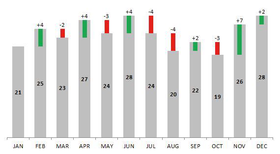 Ein Säulendiagramm mit integrierten Minisäulen, die die Abweichung zum Vormonat darstellen. Die grauen Hauptsäulen liegen auf der Primärachse. Die Minisäulen werden als gestapeltes Säulendiagramm auf der Sekundärachse dargestellt. Die untere Datenreihe ist transparent, denn diese dient lediglich als Stütze. Darüber liegen die grüne und die rote Datenreihe, welchen per WENN-Funktion nur dann Werte zugewiesen werden, wenn diese positiv (grün) bzw. negativ (rot) sind.