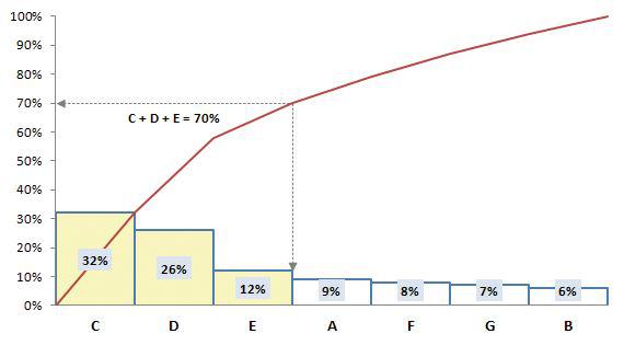 Mit Hilfe von Pareto-Diagrammen werden Häufigkeitsverteilungen dargestellt. Sie werden in der Regel als Säulendiagramm mit absteigend sortierten Werten erzeugt. Häufig wird zusätzlich noch eine Linie eingeblendet, die die kumulierten Werte anzeigt. Um wie in diesem Beispiel die Säulen direkt nebeneinander ohne Lücken darzustellen, muss die Abstandsbreite auf 0% eingestellt werden. Darüber hinaus wird hier noch mittels Pfeilen und einer Texteinblendung (erzeugt mit Punktdiagrammen) verdeutlicht, dass die Kategorien C, D und E zusammen 70% der Gesamtmenge ausmachen.