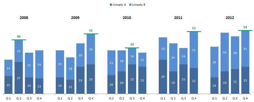 Haben Sie schon mal versucht in einem gestapelten Säulendiagramm die Gesamtsummen oberhalb der Säulen einzublenden? Diese Funktionalität ist leider von Microsoft nicht vorgesehen. Mit einem versteckten Punkt- oder Liniendiagramm mit entsprechenden Y-Werten lässt sich dies aber ohne große Mühe verwirklichen. Zur Berechnung der dafür notwendigen Daten müssen Sie lediglich die Werte der Teilsäulen eines jeden Datenpunkts addieren. Nachdem Sie dies für alle vorhandenen Datenpunkte gemacht haben, fügen Sie die so gewonnenen Daten als neue Datenreihe in das Diagramm ein und stellen als Diagrammtyp (Excel 2003) bzw. Datenreihendiagrammtyp (Excel 2010) "Liniendiagramm" ein.